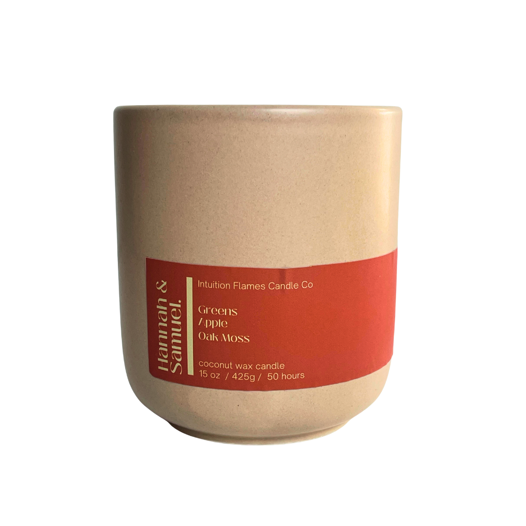 Hand-poured in small batches, this 15 oz ceramic vessel is filled with the refreshing fragrance of Greens, Apple & Oak Moss; a crisp, earthy blend that whispers of new beginnings, fresh hope, and promises fulfilled. Made with all-natural coconut wax and a crackling wooden wick, it offers 40+ hours of burn time, creating a sacred space for prayer and reflection.